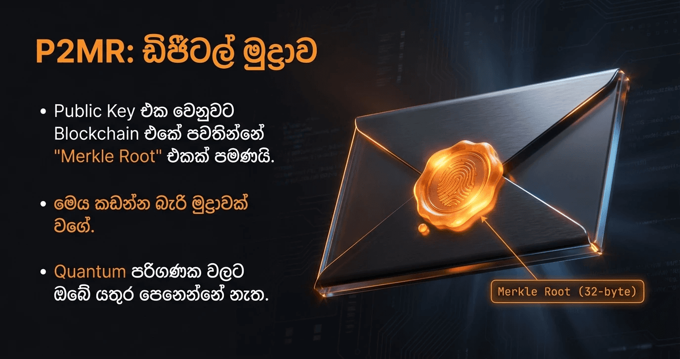 P2MR වලදී කරන්නේ අර 'internal public key' එක සම්පූර්ණයෙන්ම ඉවත් කරන එක. ඒ වෙනුවට blockchain එකේ පේන්න තියෙන්නේ 32-byte Merkle root එකක් විතරයි. මේක හරියට 'සීල් එකක්' වගේ. Quantum computer එකකට මේ මුද්රාව කඩන්න බැහැ. ඔයා ඇත්තටම සල්ලි වියදම් කරනකම් ඔයාගේ public key එක කිසිම කෙනෙක්ට, Quantum computer එකකටවත් පේන්නේ නැහැ.