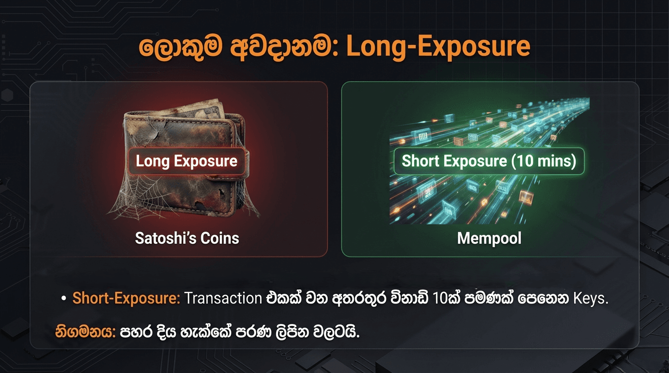 2. Short-Exposure Threat: මේක වෙන්නේ ඔයා transaction එකක් කරන වෙලාවේදී විතරයි. ඔයා සල්ලි යවනකොට විතරක් ඔයාගේ public key එක mempool එකට (transaction පෝලිමට) යනවා. එතකොට Quantum attacker කෙනෙක්ට තියෙන්නේ විනාඩි 10ක් වගේ පොඩි කාලයක්. මේක කරන්න හරිම වේගවත් quantum computer එකක් ඕනේ නිසා මේක දැනට තියෙන තර්ජනයක් නෙවෙයි.