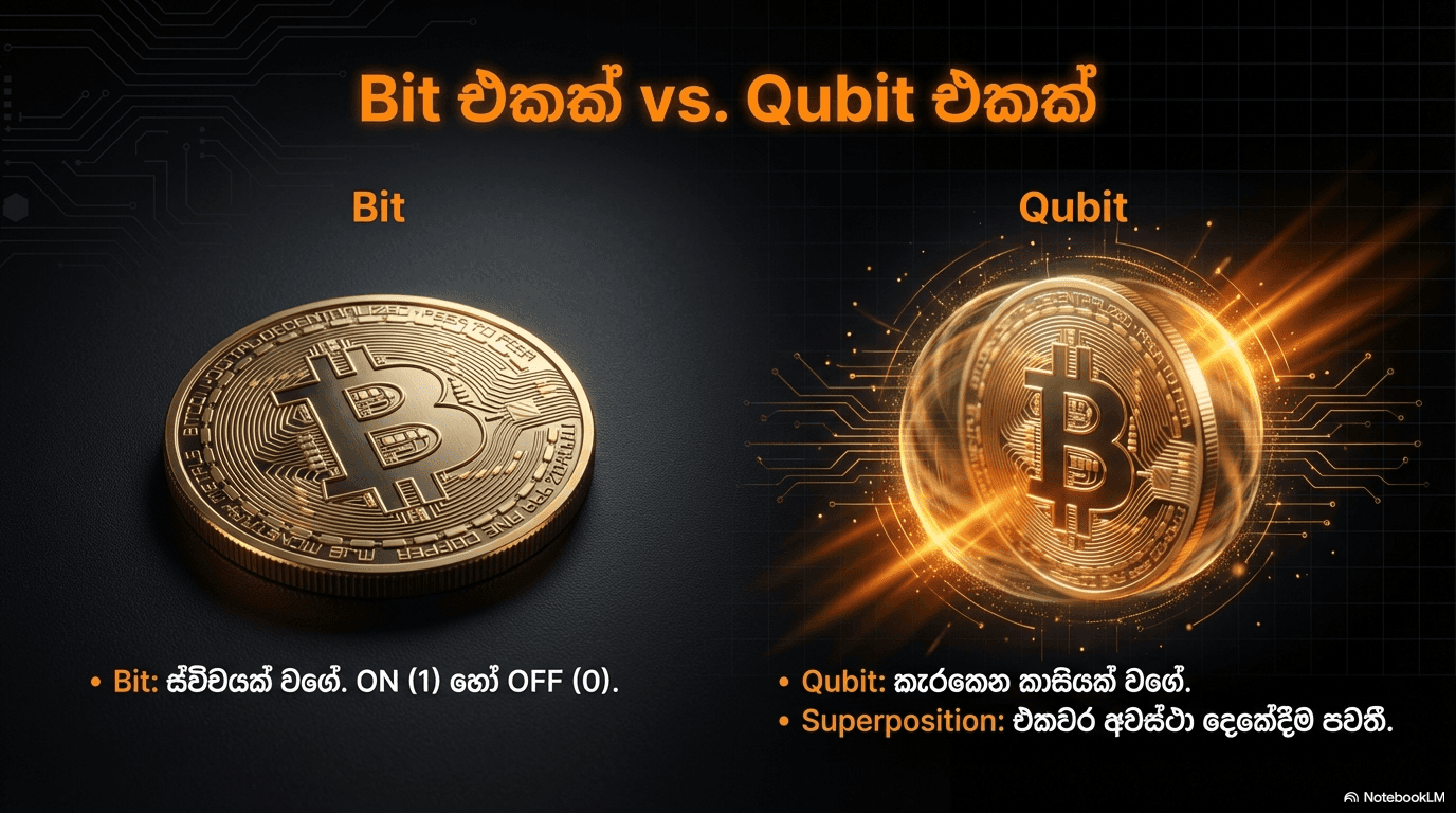 සරල උදාහරණයක්: මේක තේරුම් ගන්න කාසියක් මතක් කරගන්න. සාමාන්ය Bit එකක් කියන්නේ මේසයක් උඩ තියෙන කාසියක් වගේ; ඒකේ තියෙන්නේ 'සිරස' (1) හෝ 'අගය' (0) විතරයි. හැබැයි Qubit එකක් කියන්නේ මේසය උඩ කැරකෙන කාසියක් වගේ. ඒක කැරකෙන වෙලාවට සිරස සහ අගය කියන දෙකේම 'මිශ්රණයක්' විදිහට තියෙන්නේ. මෙන්න මේ නිසා එක වෙලාවකදී විශාල දත්ත ප්රමාණයක් එකවර පරීක්ෂා කරන්න මේ පරිගණක වලට පුළුවන්. උදාහරණයක් විදිහට, සාමාන්ය bits 8කින් කරන්න පුළුවන් දේට වඩා අතිවිශාල වැඩ කොටසක් qubits 8කින් කරන්න පුළුවන්."